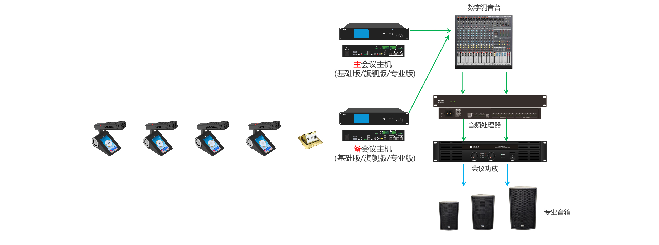 6.与中控对接 7.Dante传输 8.同声传译 9.本地扩音 10.双机热备份